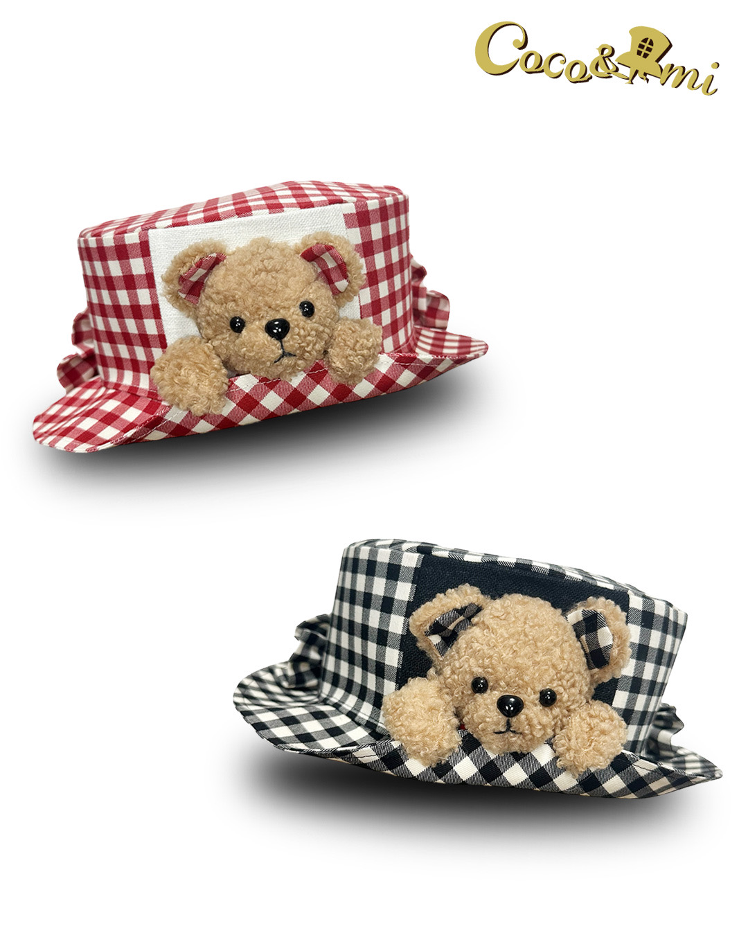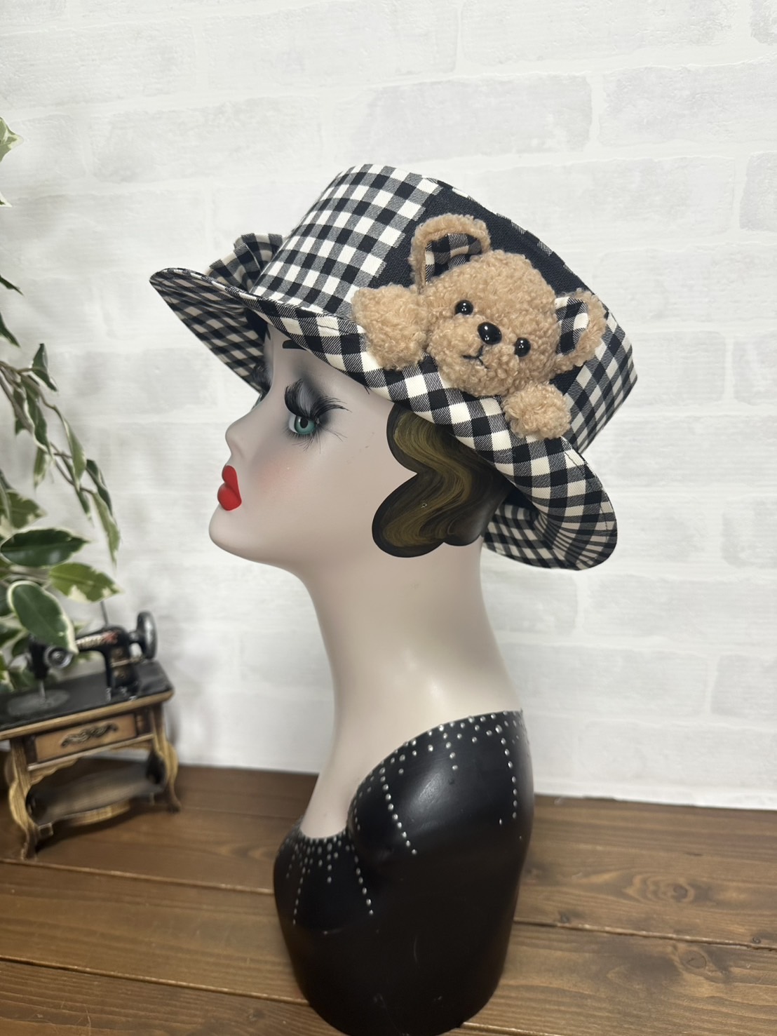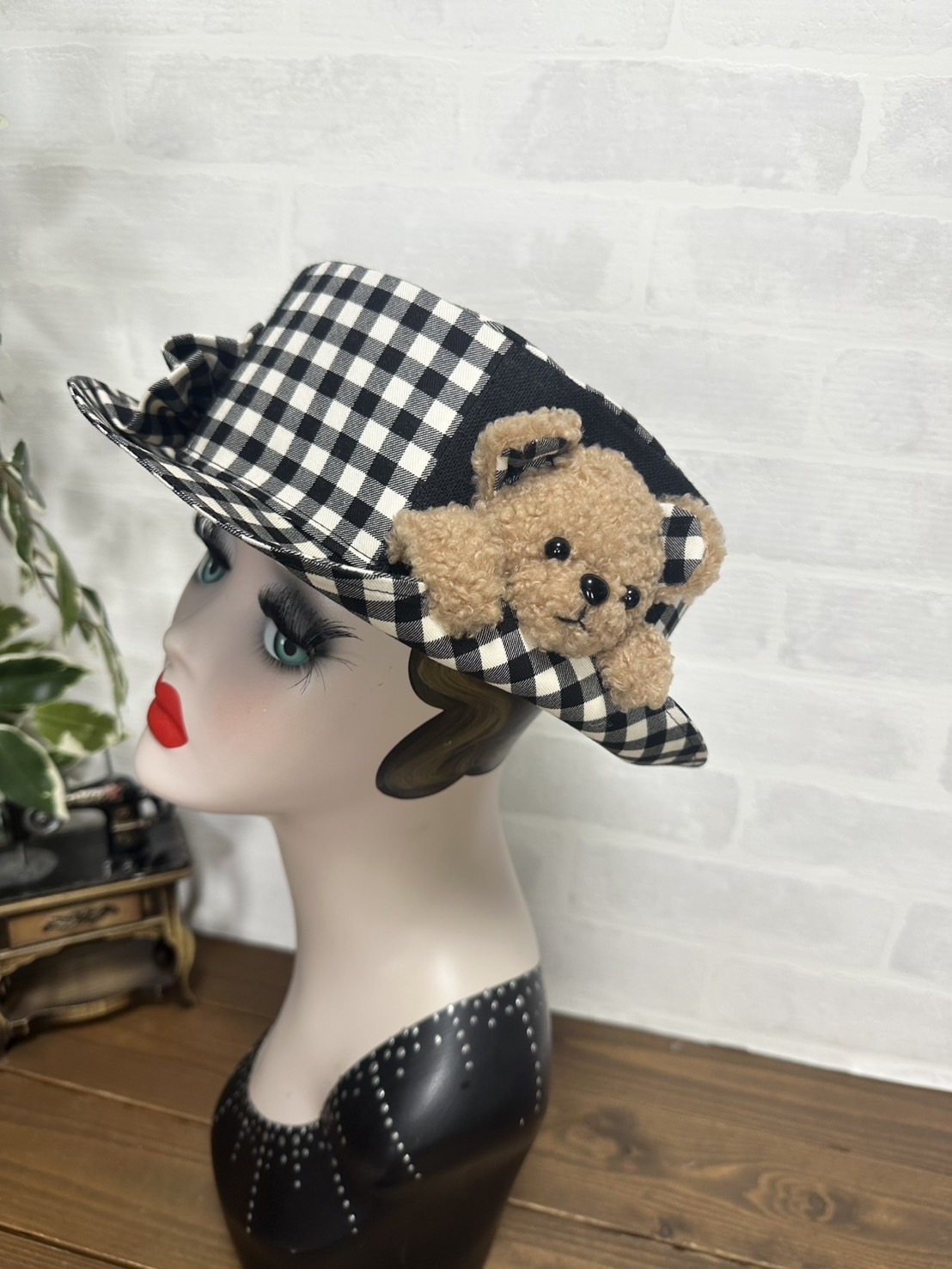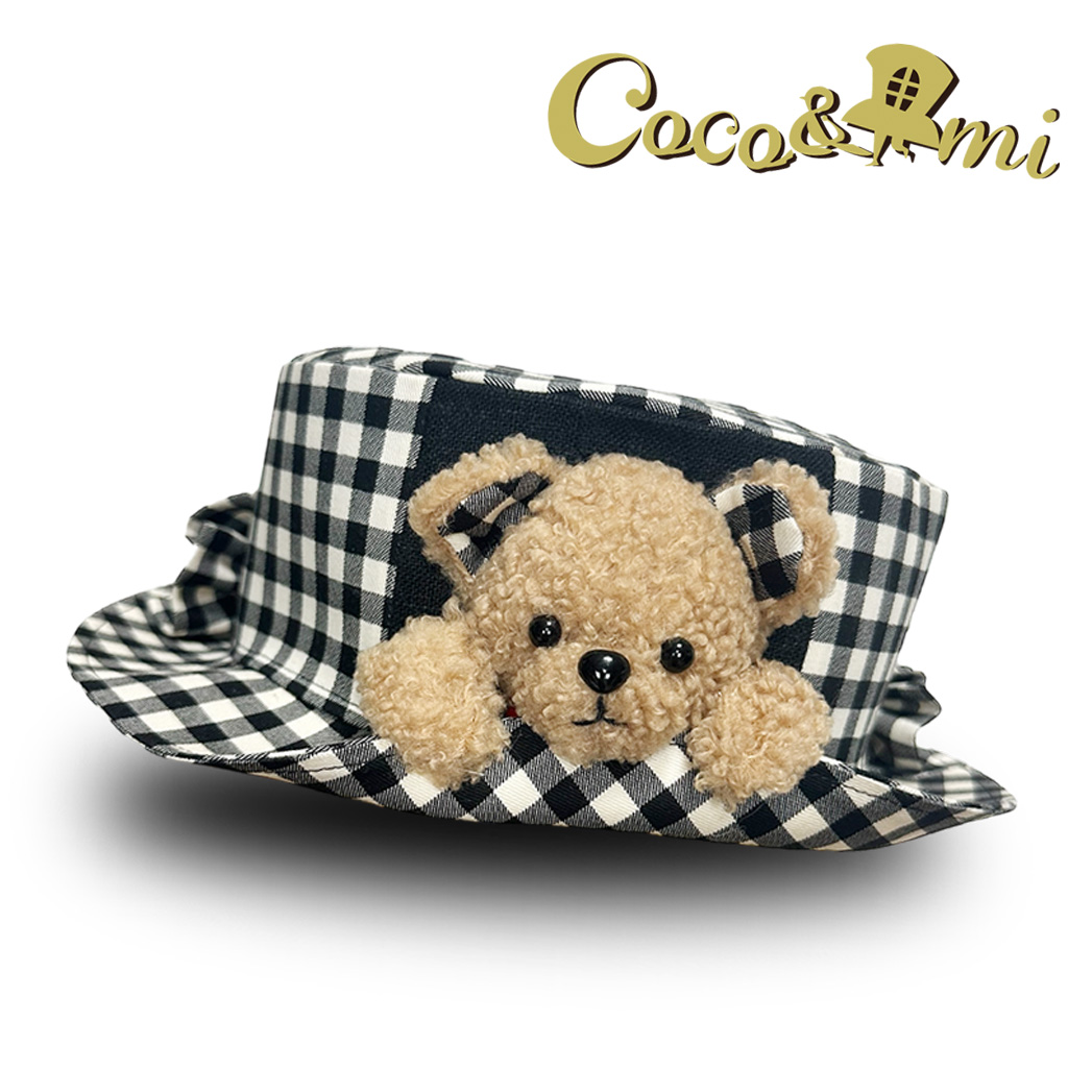 半立体のクマちゃんがぎゅっとブリムを押さえてくれる、微笑ましいデザイン。ブリムはおろしてもかぶることができます。