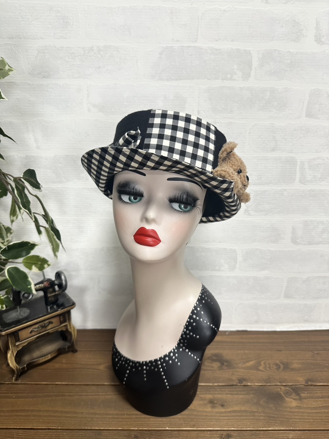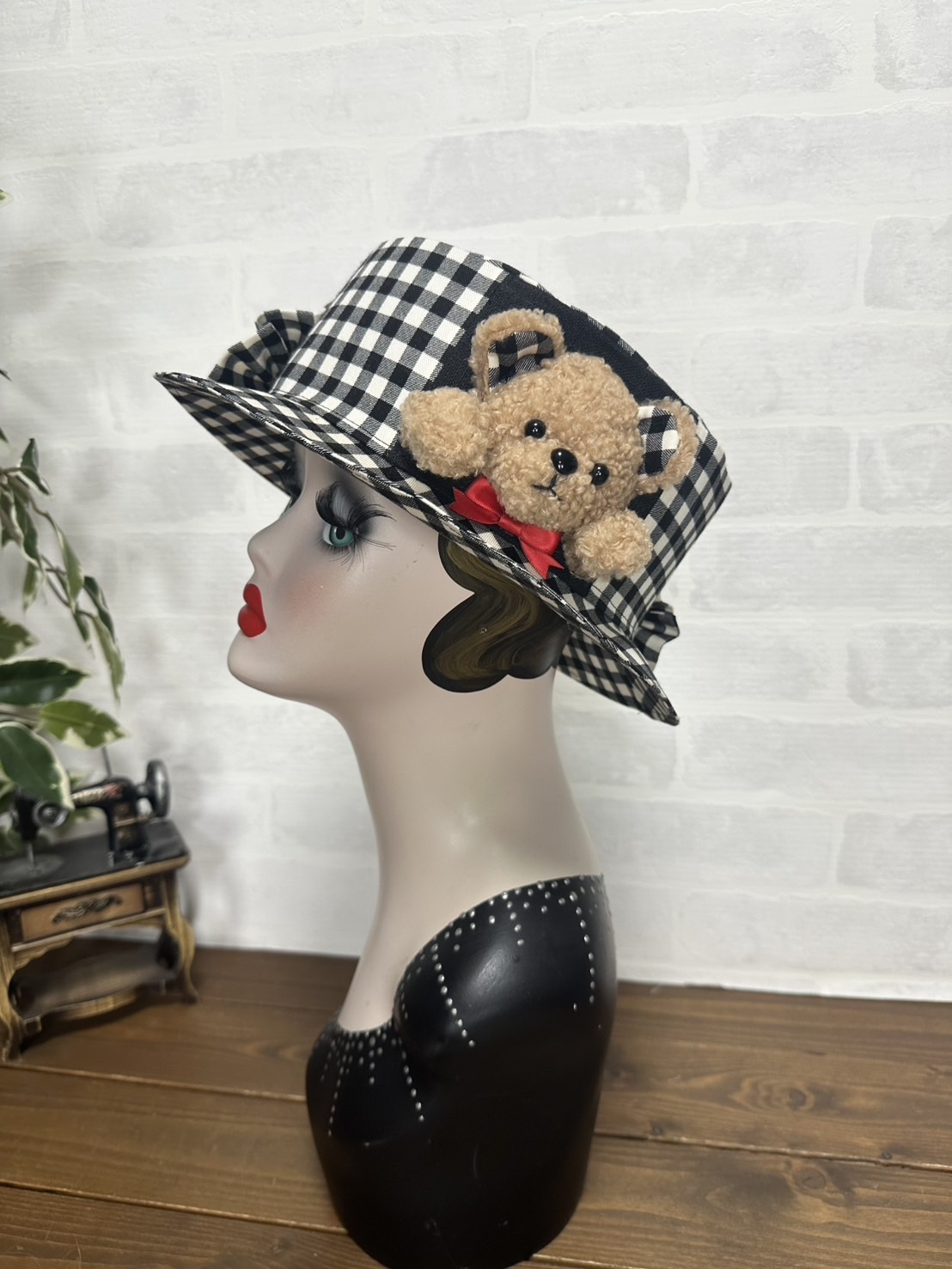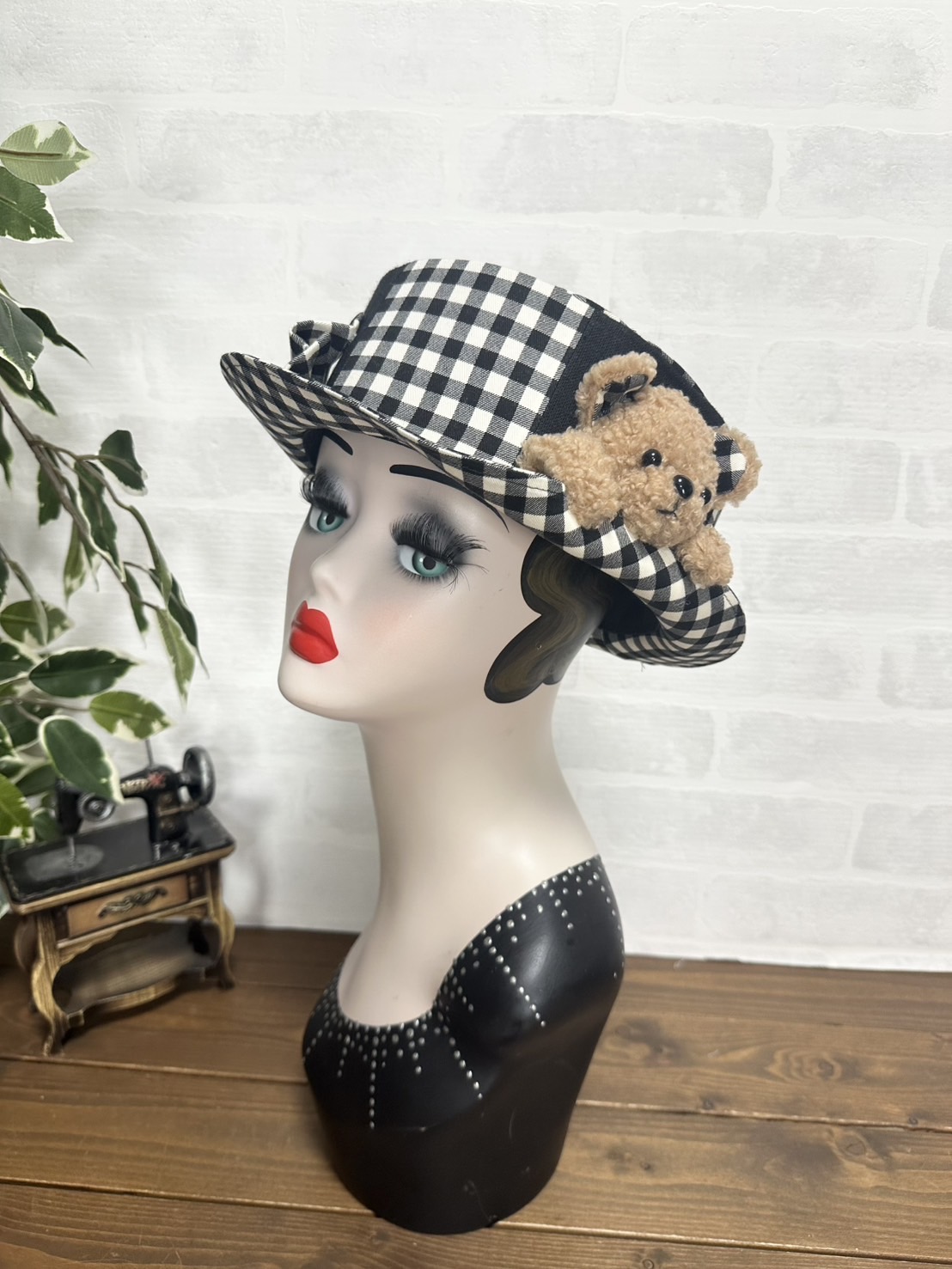 半立体のクマちゃんがぎゅっとブリムを押さえてくれる、微笑ましいデザイン。ブリムはおろしてもかぶることができます。