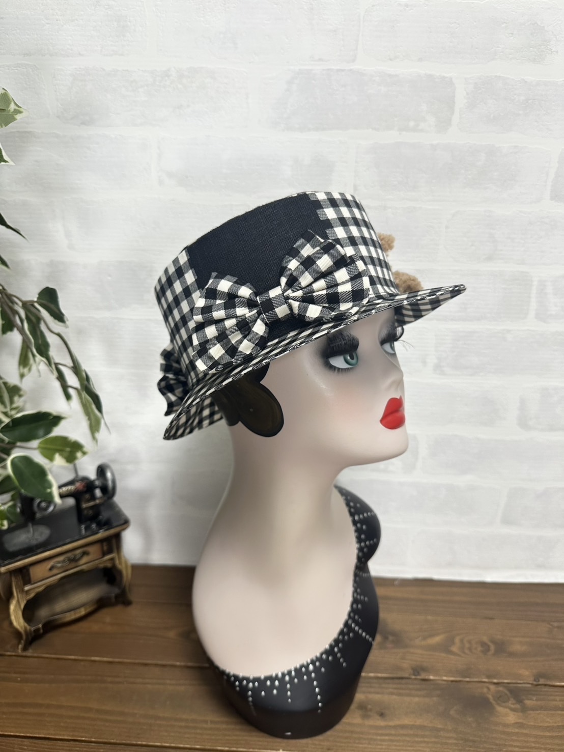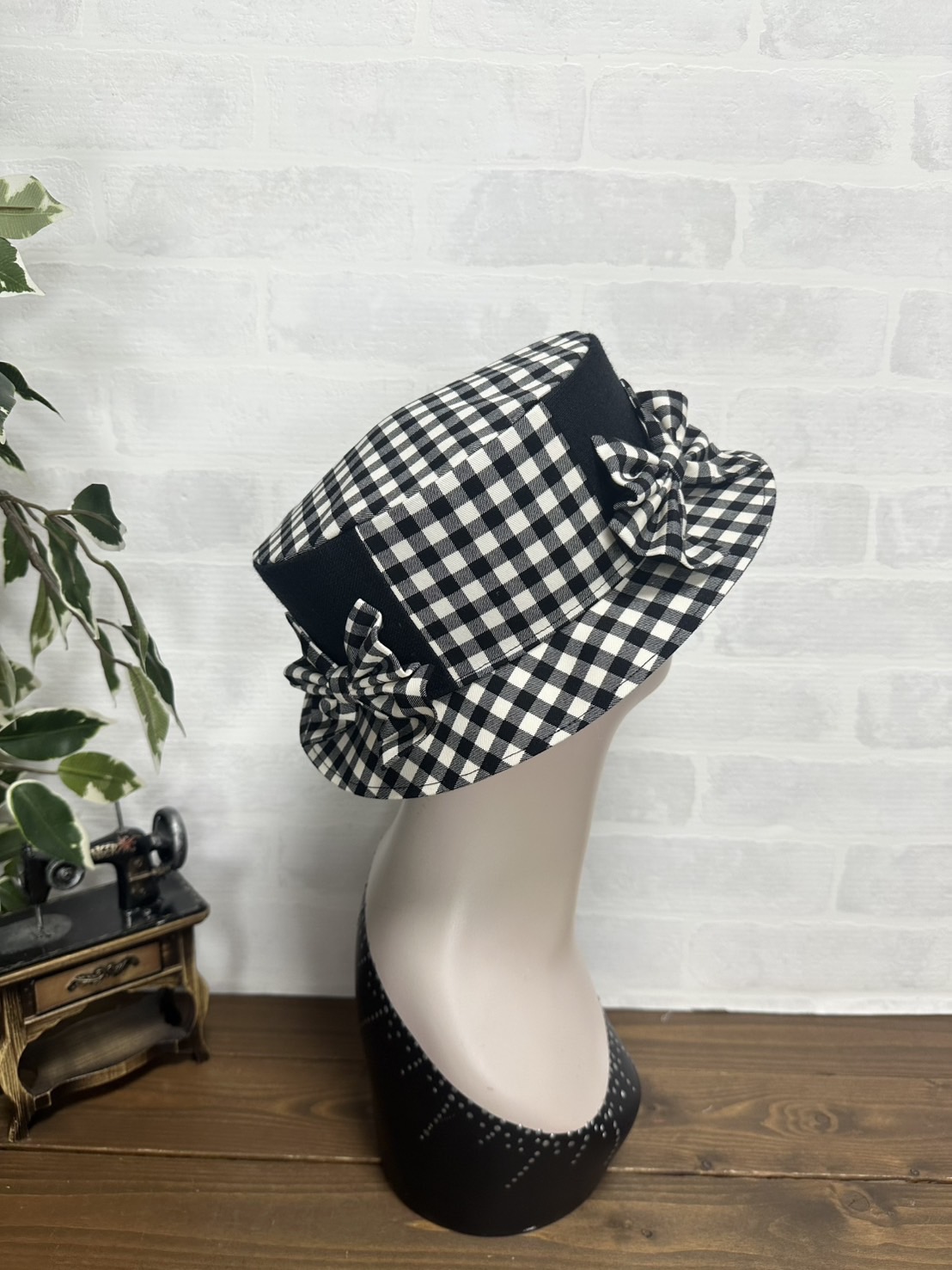 質の良いギンガムチェックで仕立て、たっぷりギャザーのリボンをそえました。