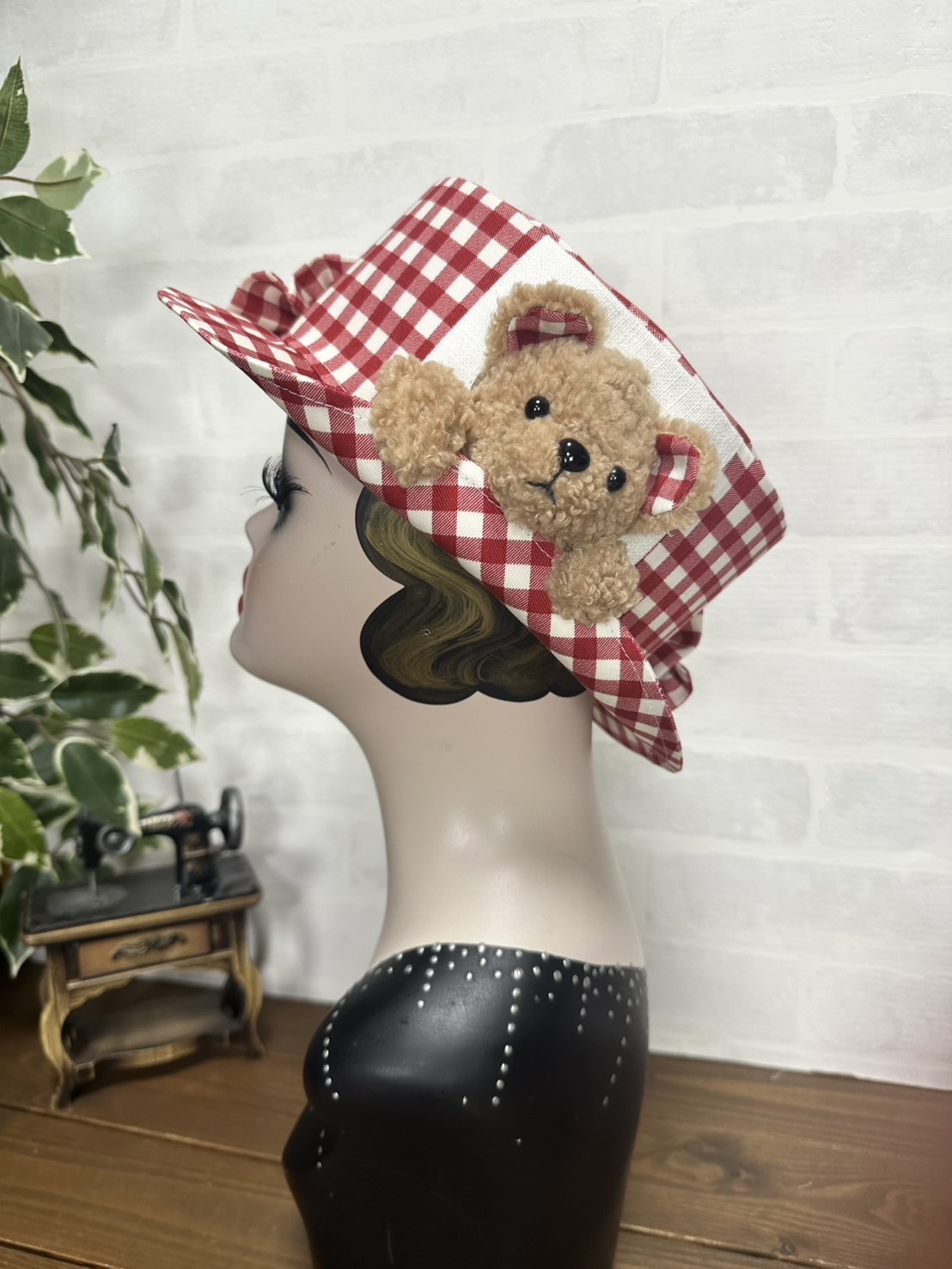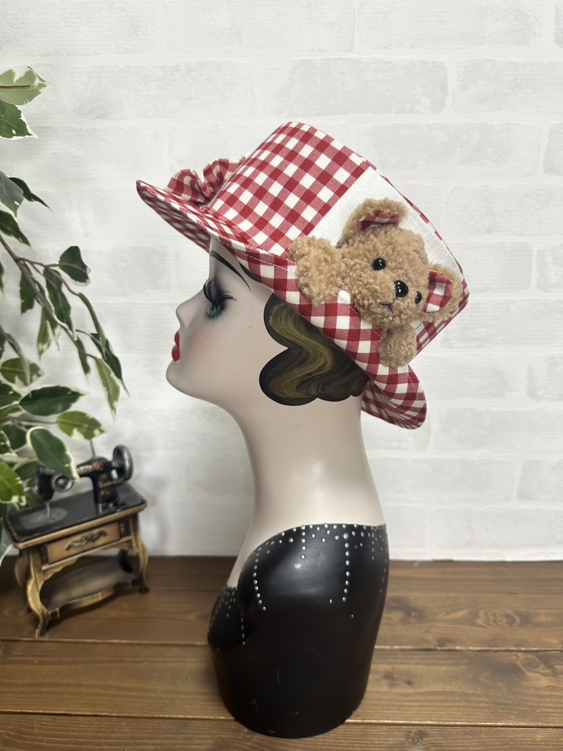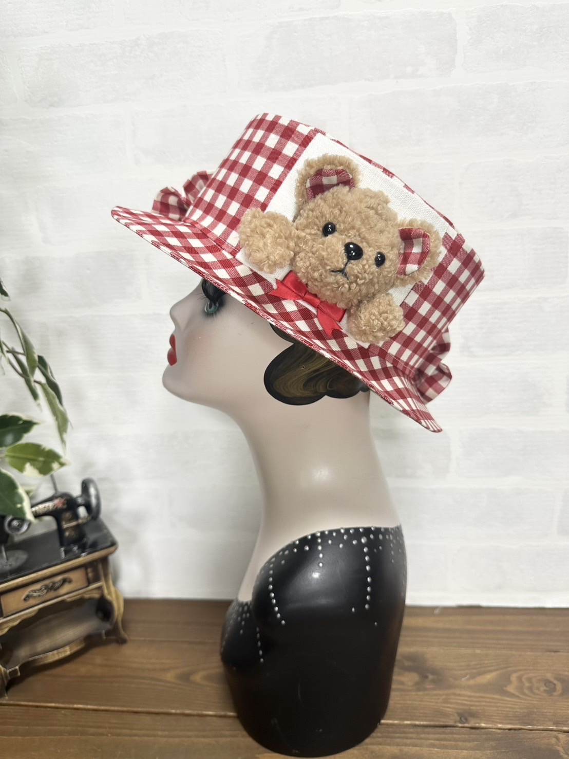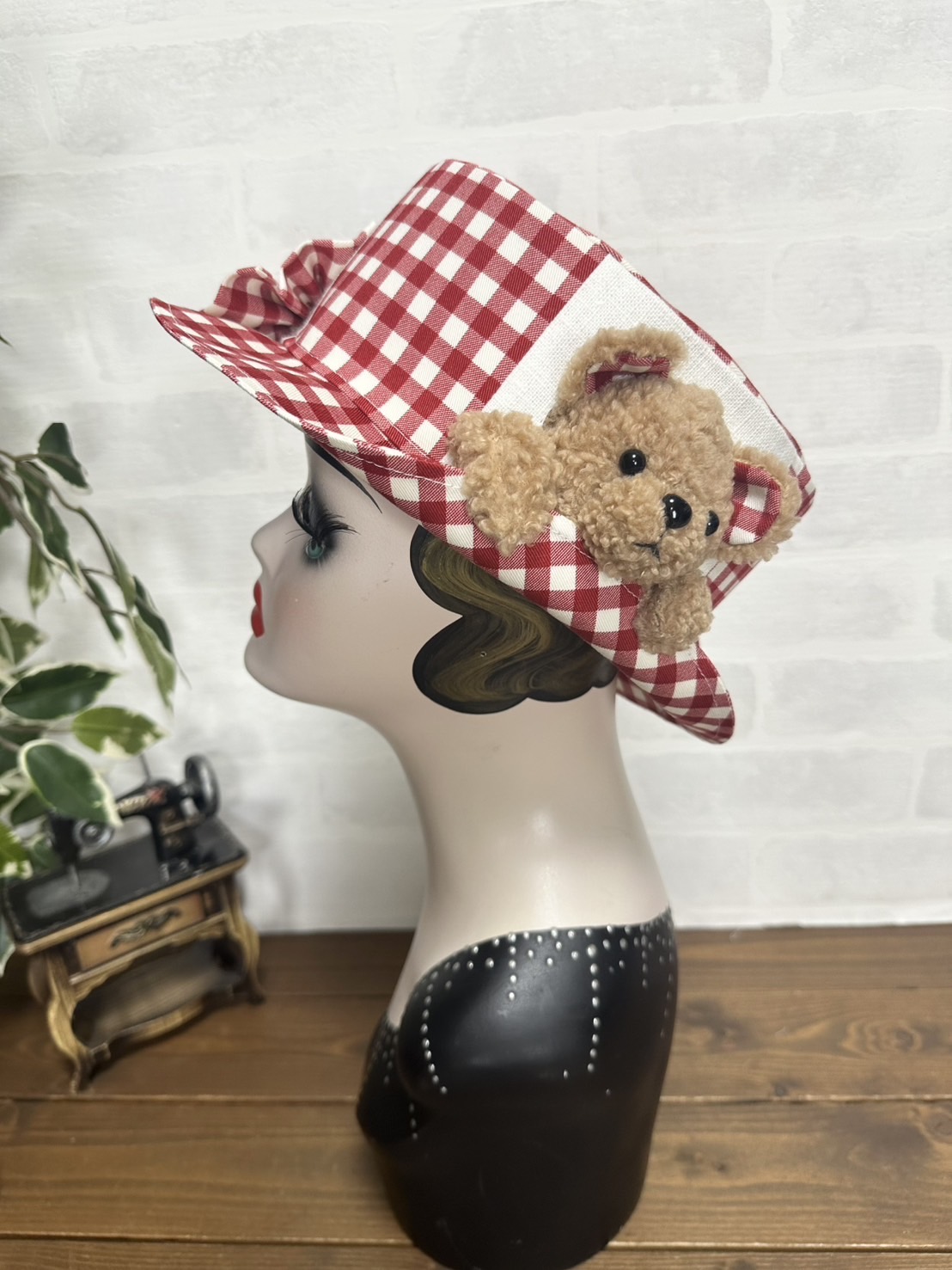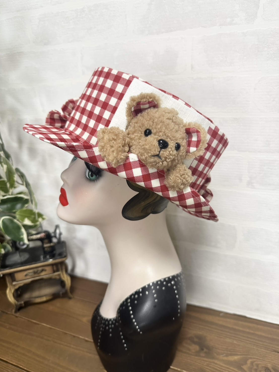 半立体のクマちゃんがぎゅっとブリムを押さえてくれる、微笑ましいデザイン。ブリムはおろしてもかぶることができます。