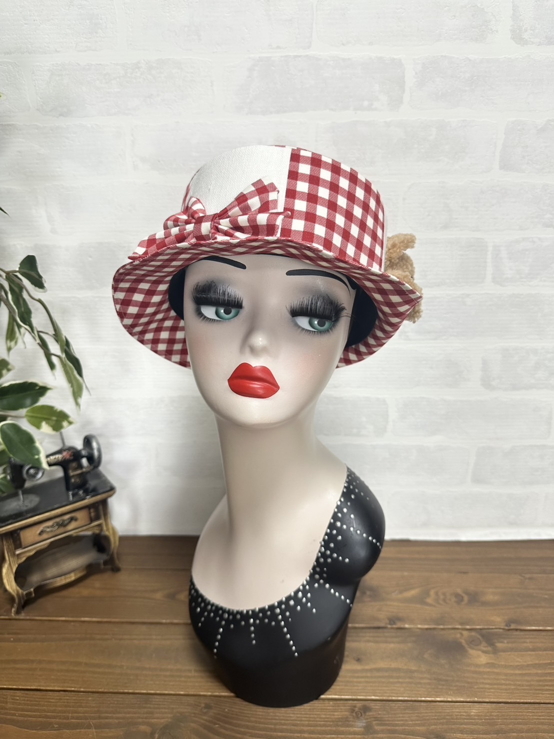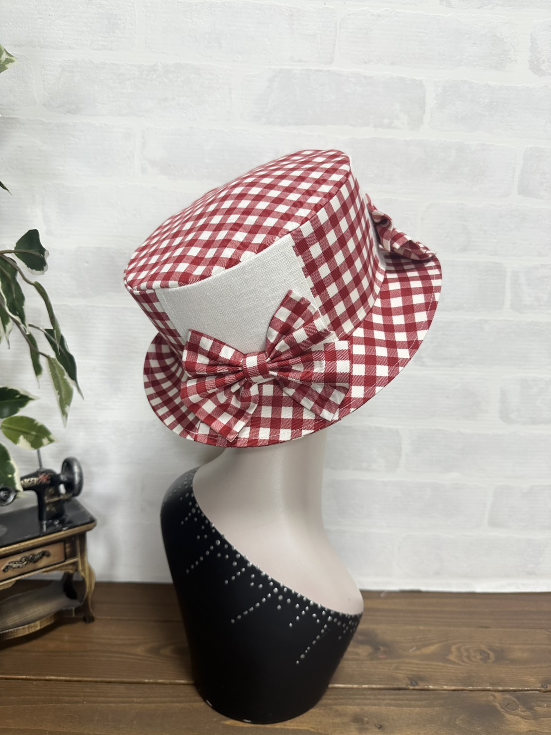 質の良いギンガムチェックで仕立て、たっぷりギャザーのリボンをそえました。