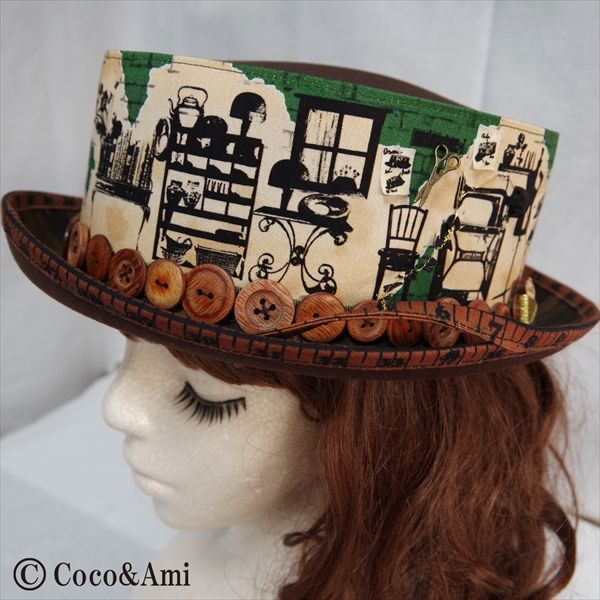 ハサミ、ミシンの手回し、壁に飾られたデザイン画など、プリントではなくリアルが散らばるアトリエ帽子。