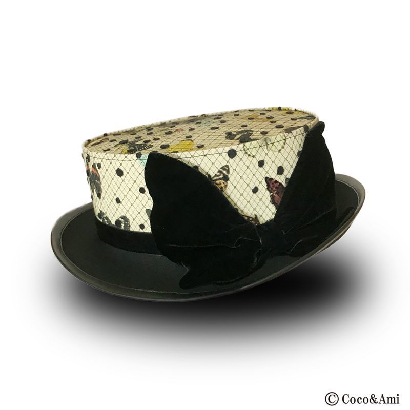鮮やかな蝶々をエレガントなドットチュールで閉じ込め、サイドのリボンも蝶々の形に。